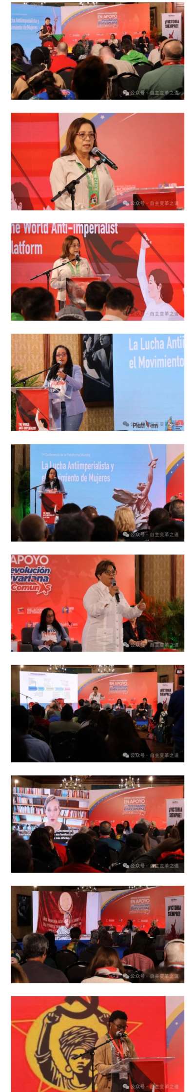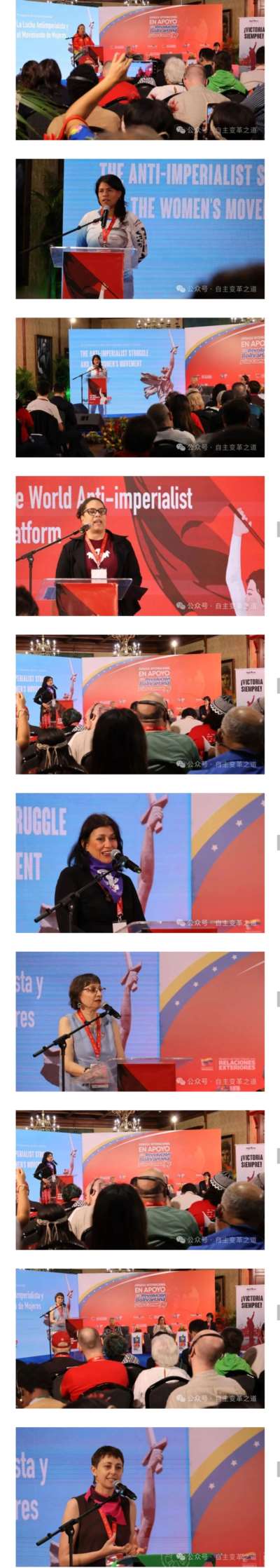 会上,前委内瑞拉全国代表大会第一副主席、现西蒙·玻利瓦尔研究所所长布兰卡·埃克豪特,委内瑞拉国民议会原住民及土著居民委员会成员、国会议员诺埃利·波卡特拉,古巴电影艺术产业研究所所长利塞特·比拉,委内瑞拉共产党组织书记路易莎·冈萨雷斯,厄尔帕纳尔共产主义活动家阿纳卡奥纳·马林,委内瑞拉国际团结与和平斗争委员会(COSI)成员乌尔苏拉·阿吉莱拉,哥伦比亚共产党委内瑞拉中央地区委员会书记阿明塔·贝莱尼奥·戈麦斯,阿根廷解放党总书记伊琳娜·桑特斯特万,阿根廷媒体传播联盟网络成员阿耶伦·科雷亚,前全国制宪大会第一副主席、现国会议员塔尼娅·迪亚兹,现统一社会主义党女性代表、国会议员迪瓦·古斯曼,前委内瑞拉女性、性别平等部长、现国会议员阿西亚·比列加斯,土耳其劳动女性组织(EKA),希腊革命理论小组马特里·帕纳约塔等进行了现场发言。英国共产党(马列)代表乔蒂·布拉、比利时共产党政治局成员亚尼克·瓦农凯伦通过视频发表了讲话。肯尼亚革命女性联盟(RWL)和“韩国”民众民主党(民众党)宣读了发言稿。