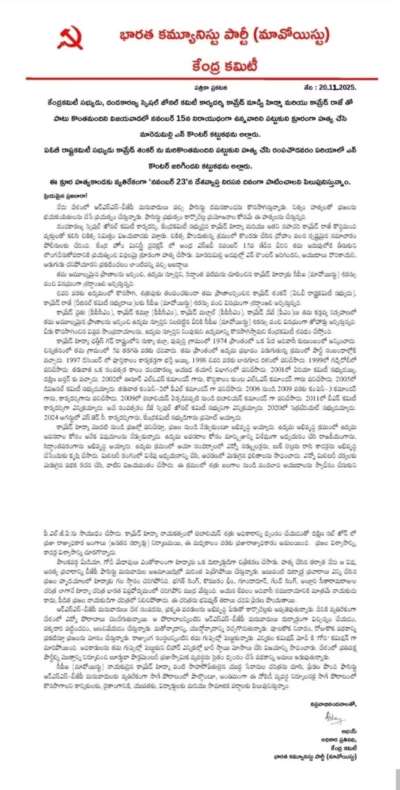 中央委员会委员、丹达卡兰亚特别专区委员会秘书马德维·希德马同志(Madvi Hidma),以及拉杰同志(Raje)和另外几个人,于11月15日在维杰亚瓦达(Vijayawada)手无寸铁地被捕,随后遭到残忍杀害,还编造了一个虚假的遭遇战故事。
