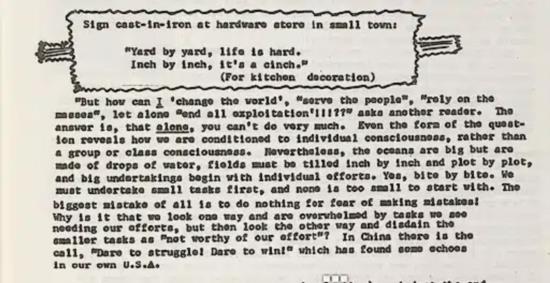 尤其引人注目的是,汤普金斯在形式与美学上的选择,恰恰反映了她对毛主义及其批评与自我批评辩证过程的独特理解。在翻译“实践”的重要性时,汤普金斯并没有直接照搬毛的格言式语言,而是创造性地将美国本土的习语与大众文化表达重新编排和运用,保留了一种朴素生动的语言气质14。因此,汤普金斯的写作风格与当时许多自称为“马列毛主义”组织所产生的文本风格相去甚远,后者的语言往往刻意模仿北京外文出版社的翻译腔调,僵硬又死板15。