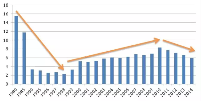 2000-2008年GDP增长率平均达到10.4%,是建国以来经济发展最平稳、波动最小的时期。2010年以来,我国再次遇到经济下行压力,经济增速从2010年10.4%下降到2014年7.4%和今年上半年的7.0%。当前这次经济下行,既有同前五次下行共同的特征,也有重大的区别。