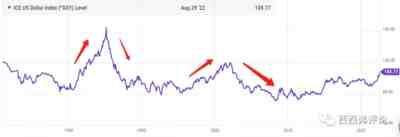 上一次美元指数达到这个高度,还是20年前的2002年。当时,从1995年开始的一波美元升值,美元指数从80,上升到2001年的最高点120,上升了50%。但随着2001年互联网泡沫破灭,和美联储减息,美元指数迅速下滑到08年金融危机之前的70-75。上一次美元周期持续大约13年时间。