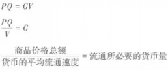 于是我们把一定期间中(例如一年),同一货币的平均流通速度,用V去表示,把流通所必要的货币量用G去表示,把商品总量用Q去表示,把一单位的商品的平均价格用P去表示。这样就可以得到下列方程式(用中文所写的部分,是该方程式第二行不用符号表示的形态):