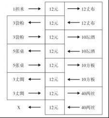 1担米——12元——12丈布——12元——3袋面粉——12元 ——10坛酒——12元——5张桌——12元——10方木板——12元 ——3丈绸——12元——40两丝