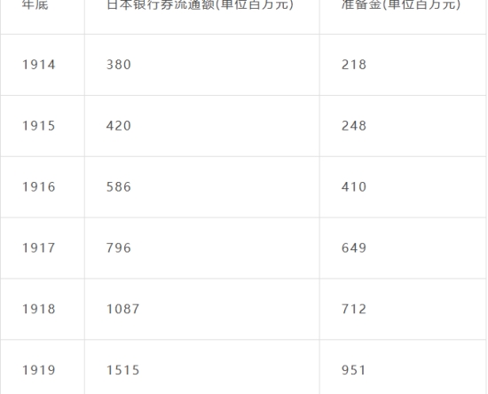 日本从1917年九月起,用大藏省令禁止金银货币及金银块出口。银行券的流通,基于上述生产及贸易的发展也不断地增加起来,呈现出信用通货膨胀的状态。在1914年当时银行券流通量仅为3亿8000万元,到1919年增加到15亿1500万元。这期间的银行券流通量及准备金的增加步骤,有如下表(见宫田保郎著《货币的实际知识》):