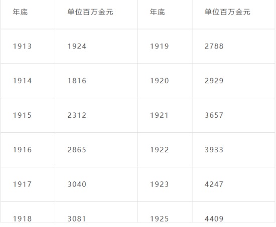 《联邦准备条例》,从1914年起,开始发挥了它的机能。世界大战的时代,是美国的货币的财富因牺牲欧洲各国而猛烈的增加的时代,在这个时期中,美国因供给交战各国以粮食武器及其他商品,并夺取交战各国的海外市场,输出贸易空前发展,因而引起巨额的黄金的流入,我们看了下表(见卡斯洛夫著《货币与信用》)就可知道: