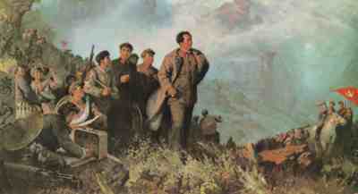 “毛主席一手叉腰,一手指着地图,说:‘要知道草地是阴雾腾腾、水草丛生、方向莫辨的一片泽国,你们必须从茫茫的草地上走出一条北上的行军路线来。’”