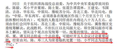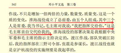 这个说法是可以从邓选查证的,但笔者认为,邓的这些话,说得也不合适。淮海战役前期策划,邓正在从西柏坡回来的路,那会淮海战役的事儿还没完全商定,毛不可能提前亲口授受指挥权(有可能说南线作战交你们中原局统筹一类的话)。总前委成立时,邓与毛相隔上千里,不可能亲口相授指挥权。