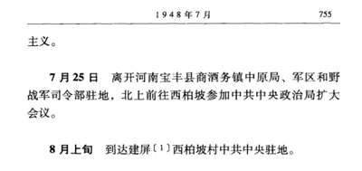 7月25日离开河南宝丰县商酒务镇中原局、军区和野战军司令部驻地,北上前往西柏坡参加中共中央政治局扩大会议。8月上旬到达建屏西柏坡村中共中央驻地。