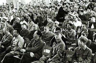 ◆七大会场:毛泽东、朱德等人坐在台下和代表一起听报告。