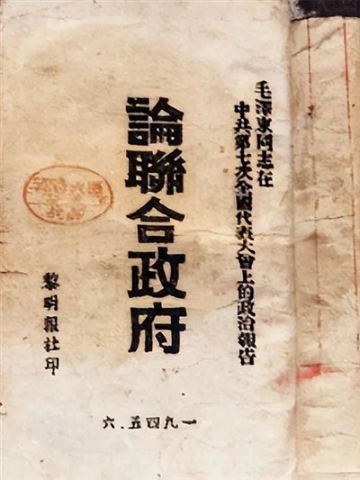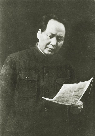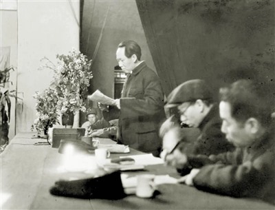◆在中国共产党第七次全国代表大会上,确定把毛泽东思想作为中国共产党的一切工作指针。图为毛泽东向大会致开幕词。