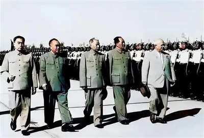 毛主席率领刘少奇、朱德、周总理陪同赫鲁晓夫检阅我三军仪仗队