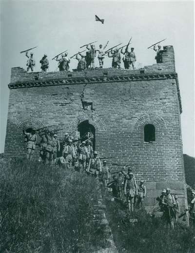 八路军攻克河北省涞源东团堡后,战士们在长城烽火台上欢呼胜利