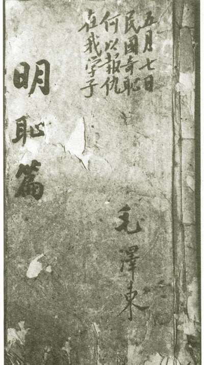 ◆1915年5月7日,日本帝国主义逼迫袁世凯签订灭亡中国的“二十一条”。毛泽东在湖南第一师范刊印的《明耻篇》封面上题词明志:“五月七日,民国奇耻,何以报仇,在我学子”。