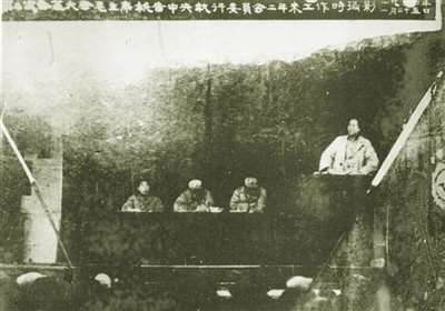 ◆1931年11月1日至5日,中国共产党苏区第一次代表大会在瑞金召开。会议在“左”倾冒险主义者的领导下,对以毛泽东为代表的正确路线进行指责,排挤他对党和红军的领导。主席台右四为毛泽东。