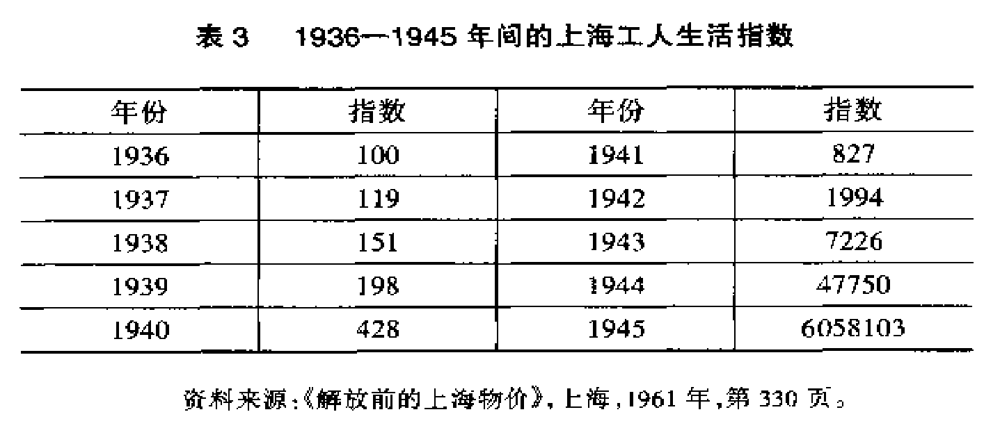 民族主义当然是共产党在抗战时期吸引追随者的主要旗帜,但不是惟一的旗帜。物价上涨也是上海工人当时面临的主要问题。如表3所示,他们的生活费用直线飙升。上涨的物价中,最重要的莫过于米价。虽说周边都是中国盛产大米的地区,可是从1937年以后,上海却要依赖从国外进口大米。日军占领江南地区后,不仅要把当地的大米供自己使用,还要运回日本,上海大米不足,便强迫上海从西贡购买,而当时货币正在大幅贬值。因而引发了普遍的抢米暴动,光是在1939年12月,上海就发生了75起。上海工部局负责社会与产业事务的埃利诺·辛德尔(Eleano Hinder)对这一危机曾作过描述: