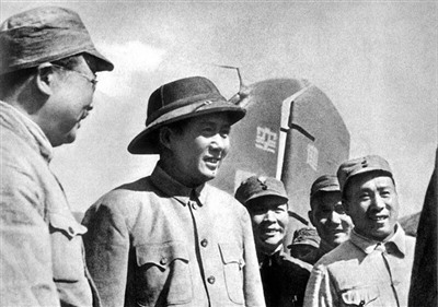 ◆1945年10月,毛泽东重庆谈判归来,与李克农、谭政等人在延安机场。