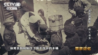 陕北地区水资源匮乏,为了改善卫生条件,让孩子们使用流动的净水洗手,保育员特别制作了用于洗手的木桶。