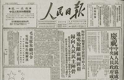 ◆1949年9月29日,《人民日报》关于陶峙岳、包尔汉率新疆军政人员通电脱离广州政府的报道。