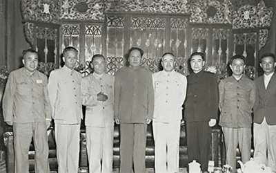 ◆20世纪50年代初,毛泽东与邓力群等人合影。左起:朱德、刘少奇、赛福鼎·艾则孜、毛泽东、包尔汉、周恩来、邓力群、德林。