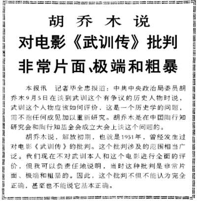 就在毛主席提出对《武训传》批判34年后的1985年9月6日,也是毛主席逝世后的第9年,《人民日报》在第1版刊发了这样的一篇报道《胡乔木说对电影<武训传>批判非常片面、极端和粗暴》: