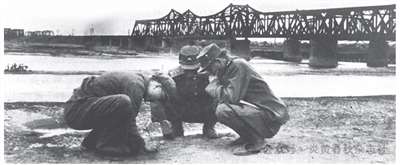 中朝两国铁道抢修部队的领导共同研究施工方案。左为我军铁道兵团工程部长彭敏,右为朝铁指局长权泽