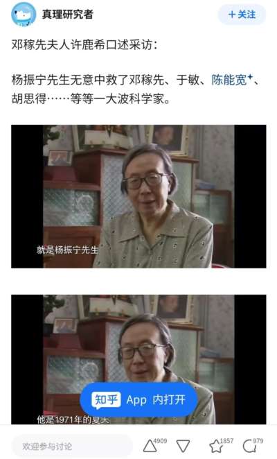 杨振宁先生逝世,知乎“如何看待杨振宁这个人?”问题下的高赞回答,截取了邓稼先夫人许鹿希的一段访谈视频: