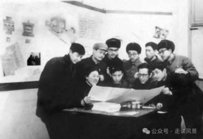 这张反映“革命师生共同学习”的照片,摆拍得很不自然。当年的许多新闻照片,都是这么“摆”出来的。图中左一是为我做油画箱的同班同学沈士清。他来自南京,毕业后返厂工作;中年病逝,十分可惜。就用这幅照片留个纪念吧。