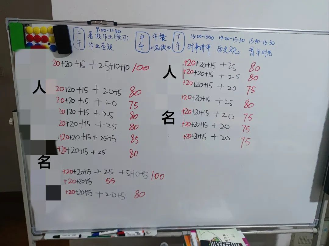但是这不意味着什么情况都必须要把分数维持在某个水平。如果一个学生有一天不来,那么他这一天就没有加分;如果他来了半天,那么他没来的那半天分数也不能随便加上。这种做法是为了保证学生的出勤率,孩子们如果想要获得奖品,那么他就需要积极地来我们这里,不能因为他个人主观的原因想不来就不来,这样我们的经营状况要出问题的。