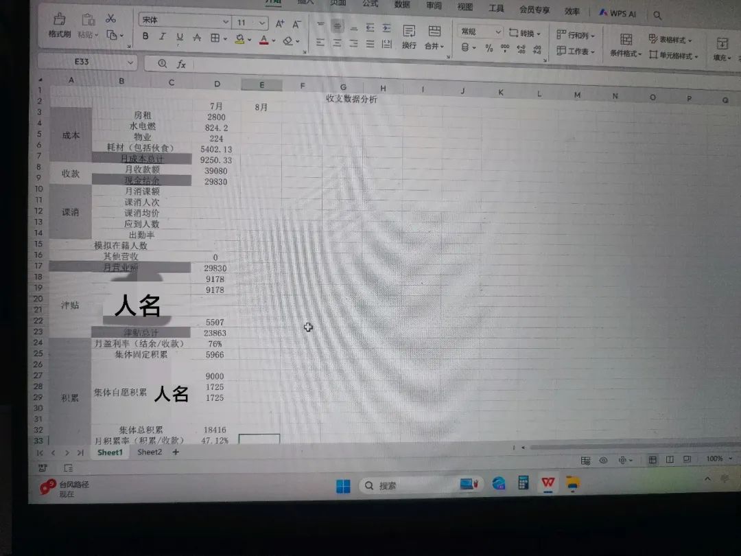 关于老师的津贴分配。首先我们是做按劳分配,但因为是暑托班,每个老师一天都要一直负责管理、辅导和教学的,所以并没有算得非常细,就按劳动时间来算。现在有三个老师是分配津贴的,有一个老师在第三周的时候才来,所以他实际上上个月五个星期做了三个星期的工作,另外两个老师都做了五个星期的工作,所以他们的津贴比例是5:5:3(11473:11473:6883)。但是最后拿到的津贴,按照我们的规定,是去掉集体固定积累(也就是净利润的百分之二十后)的,所以最后的结果就是你在图上面看到的那样,比如图中有两个成员应得津贴9178元,这是在11473元的基础上减掉了20%以后的(规定小数点后的数额不做计较,直接贡献集体),而“自愿积累”是在百分之二十之外凭集体成员自身意愿在该月应得津贴中拿出一部分积累到集体中的资金,其中有一个成员自愿积累9000元,所以个人积累率为(9000+11473×20%)/11473≈98.4%。而集体总积累就是固定积累加全部自愿积累的和,七月积累情况约为18416元,占收入约一半,即47.12%。