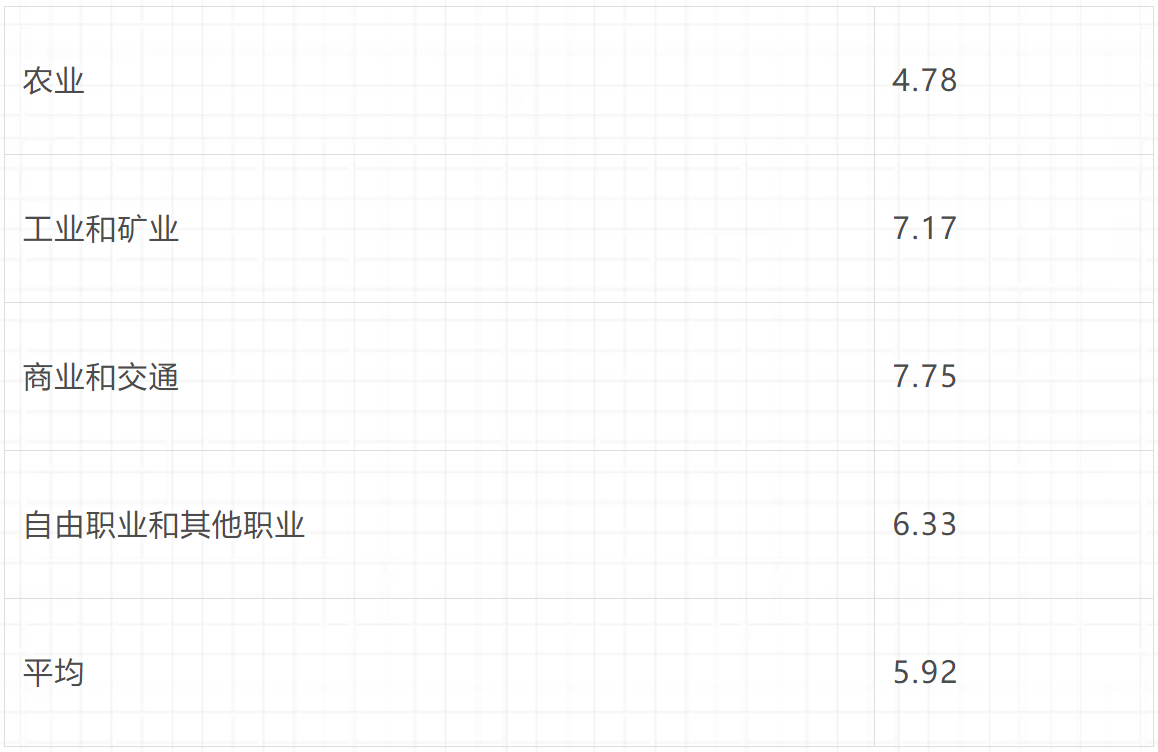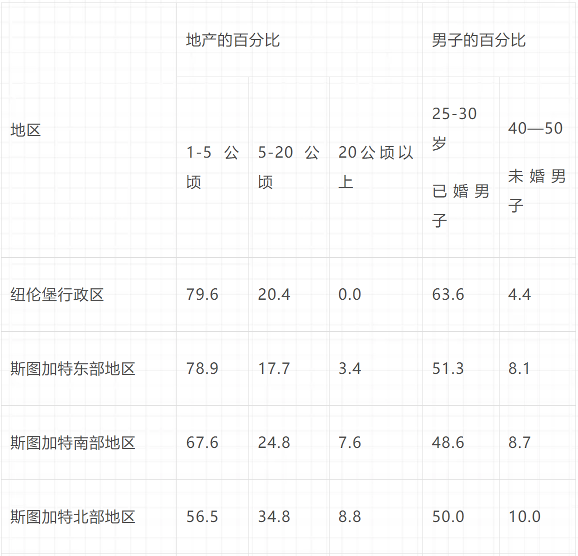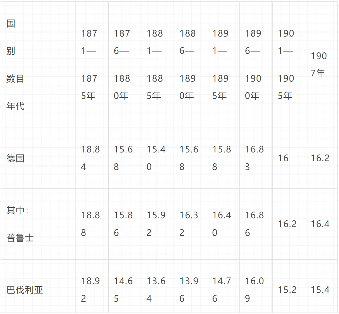 但是,对结婚产生重大影响的不仅是职业状况,而且还有财产状况。《施莫尔年鉴》1885年第一卷报道过维腾堡王国的人口统计资料,从可以清楚地看到,25至30岁的已婚男人的人数随着大地产的增加而减少了,而40至50岁之间的未婚男人的人数却增加了。请见下表:
