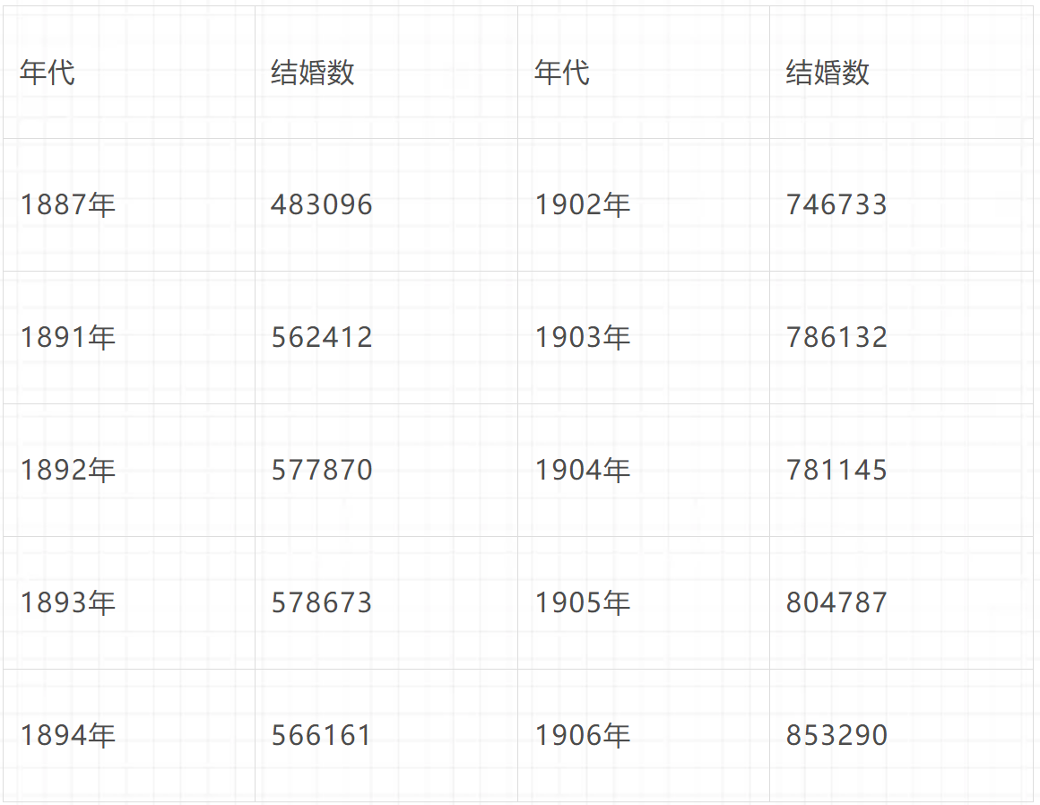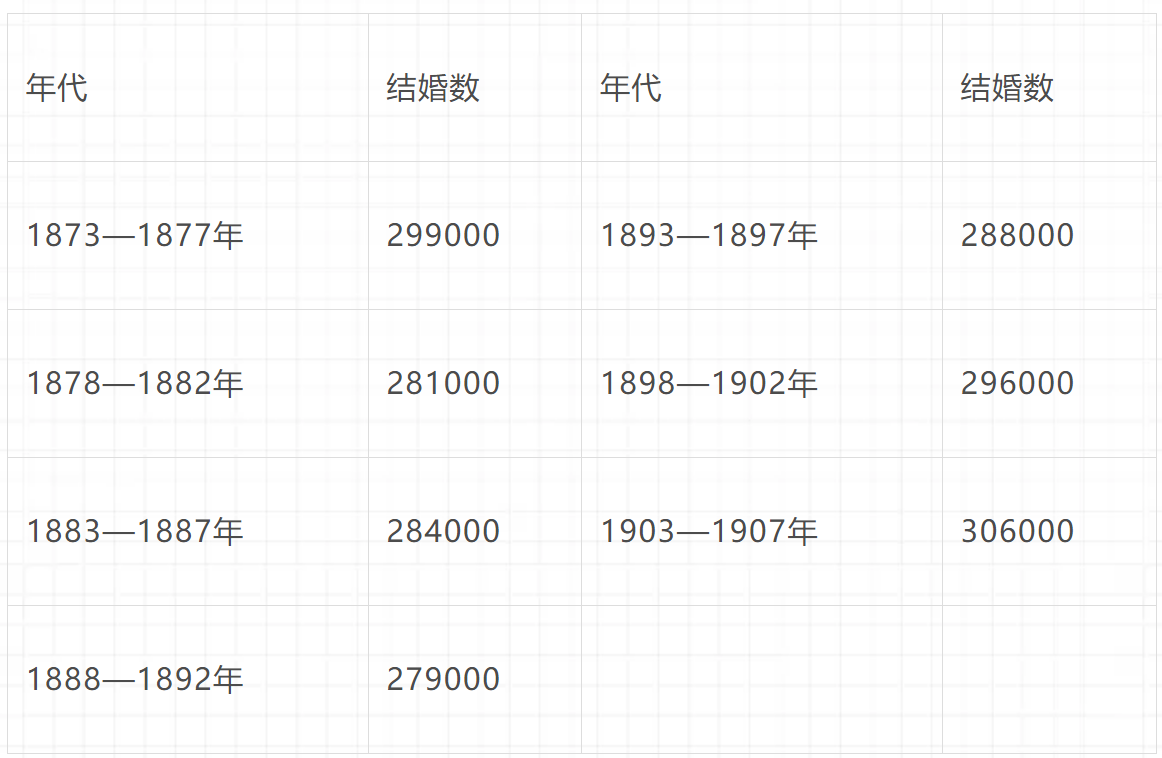 大多数国家的结婚数目随工业的繁荣或危机而上下波动,在这方面,德国表现得最为明显。在德法战争之后的1872年,像1873年的法国一样,德国的结婚数最多(423900)。从1873年开始,结婚数减少,到危机最严重的1879年,数目锐减至最低(335113);一直到1890年即经济繁荣昌盛的那一年,结婚数目又慢慢上升;但是1892年数目再次下降,而在繁荣年代又有上升,在工业繁荣达到最高峰的1899年和1900年,结婚数也增至最高点(1900年为476491,1899年为471519)。而新的危机又使这一数目下降。1902年的结婚数又减少到457208,而1906年和1907年又分别增至最高点(498900和503964)。如果说1906年结婚数比1905年增加13004,那么1907年的经济危机的影响表现在结婚的绝对增长数减少(同1907年相比,1906年仅仅增加4974)和结婚数相对减少(每千名居民的结婚平均数从8.2减至8.1)。