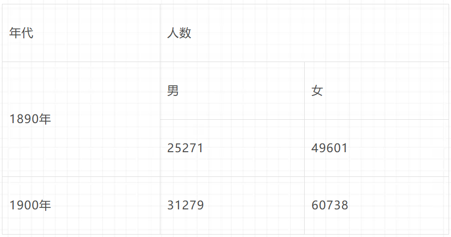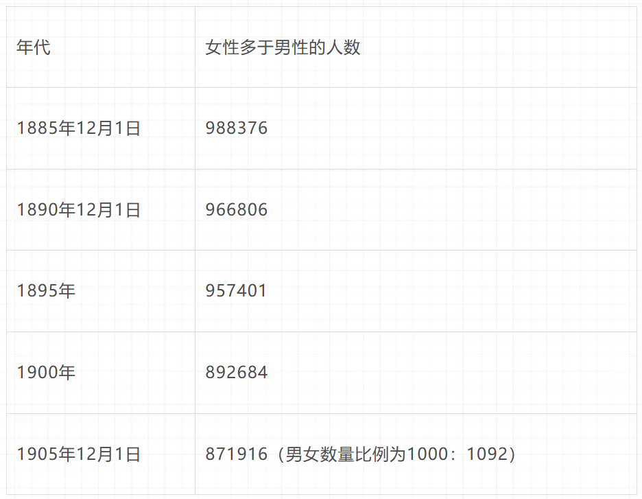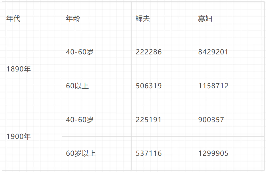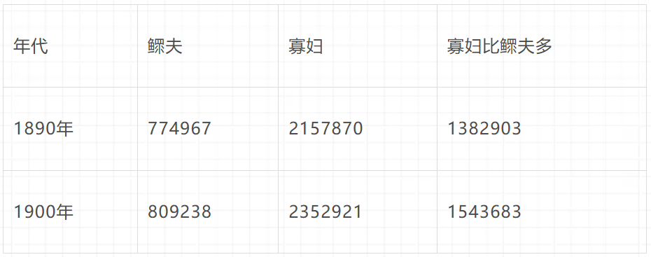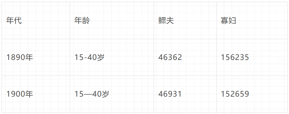 两性人口比例的巨大悬殊逐年变化,女性比男性人数越来越多。此外,从鳏寡者和离婚者的人数也可以看出同样的问题。1890年和1900年的人口调查表明,鳏寡人数如下: