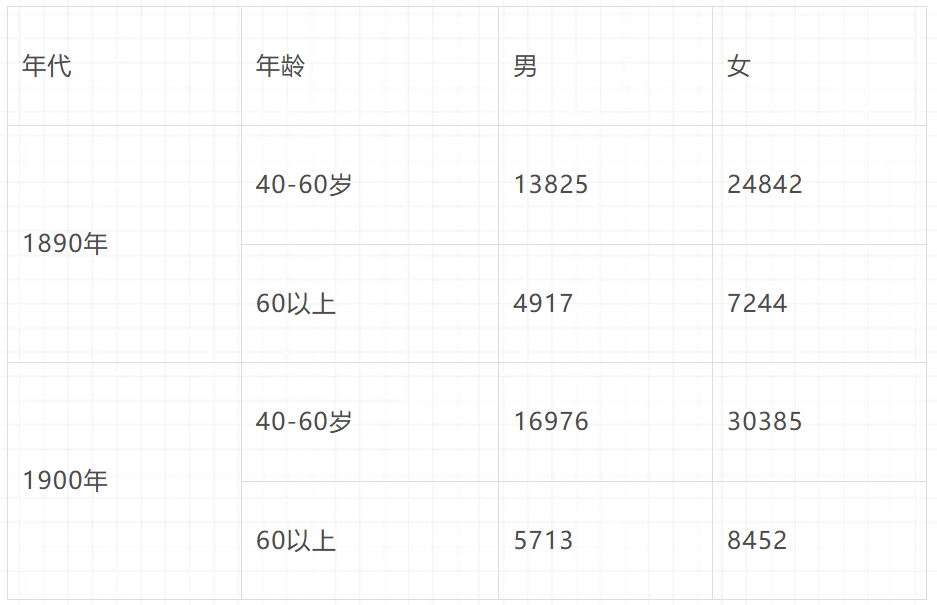 统计表明的另外一种现象十分重要:妇女的平均年龄高于男人,所以老龄妇女多于老龄男人。根据1900年的人口调查,两性的年龄状况如下: