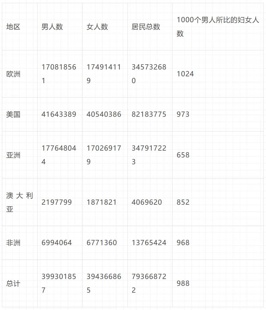 上述数字可以使许多人惊讶,除了欧洲是1000个男子对1024个妇女外,世界各地的男女比例正好相反。假设世界其他地区也作过人口调查,但对女性人口数字往往有所遗漏,比如在有穆斯林居民的各国,女性的统计人数往往比实际人数少。不过我们可以肯定,除欧洲的个别国家外,女性人口大大超过男性人口的地方几乎没有。