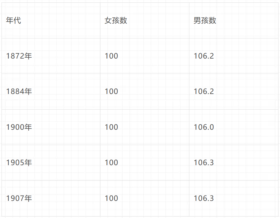 《德意志帝国健康和人口统计关系》,1907年柏林版第29页。1907年男女死亡人数的比例是109.3:10。