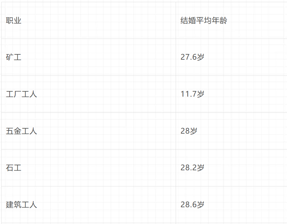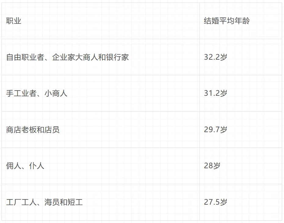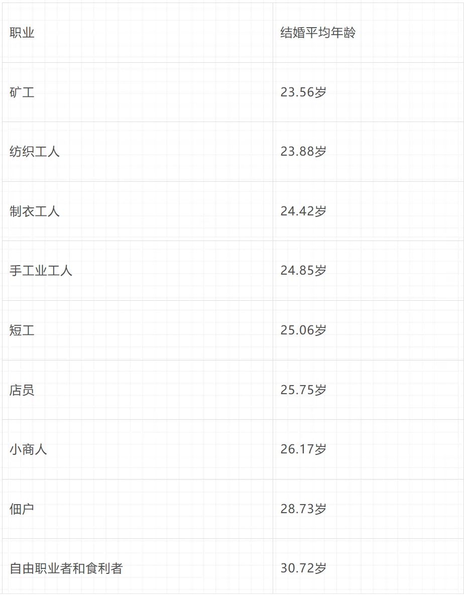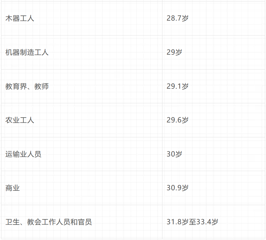 根据安泽尔统计,1840—1871年英国的具有优越地位和受过良好教育的男性,平均结婚年龄是29.95岁,但1871年以后,这一阶层男性的结婚年龄更大,从1880—1885年各种职业者的结婚平均年龄如下: