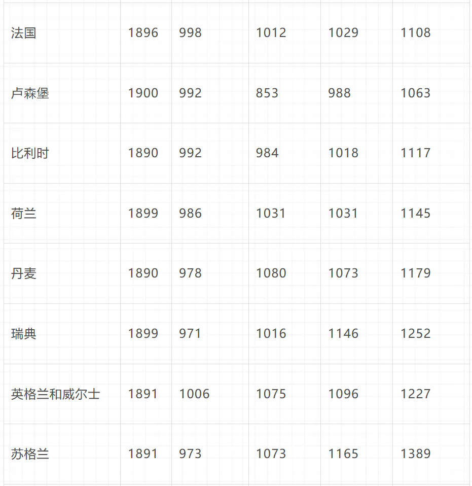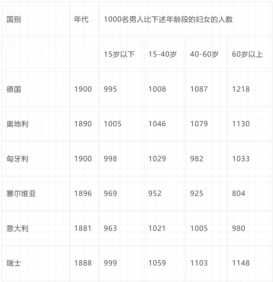 在其他国家,上述4个年龄段中的男女比例如下(见《德意志帝国统计》第150卷第91页):