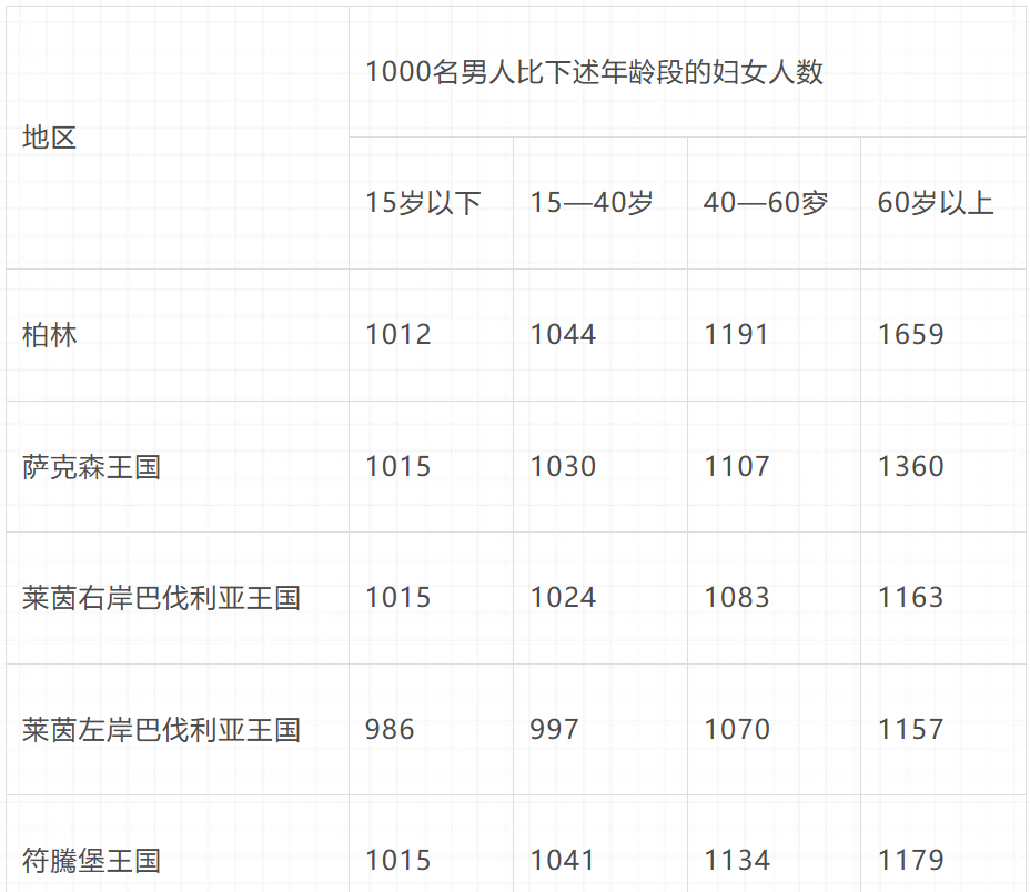 德国妇女过剩,无论是从各邦各地区的分布情况来看,还是从年龄段来看差别都很大。根据1900年人口调查(见《德意志帝国统计》第150卷第92页)具体情况如下: