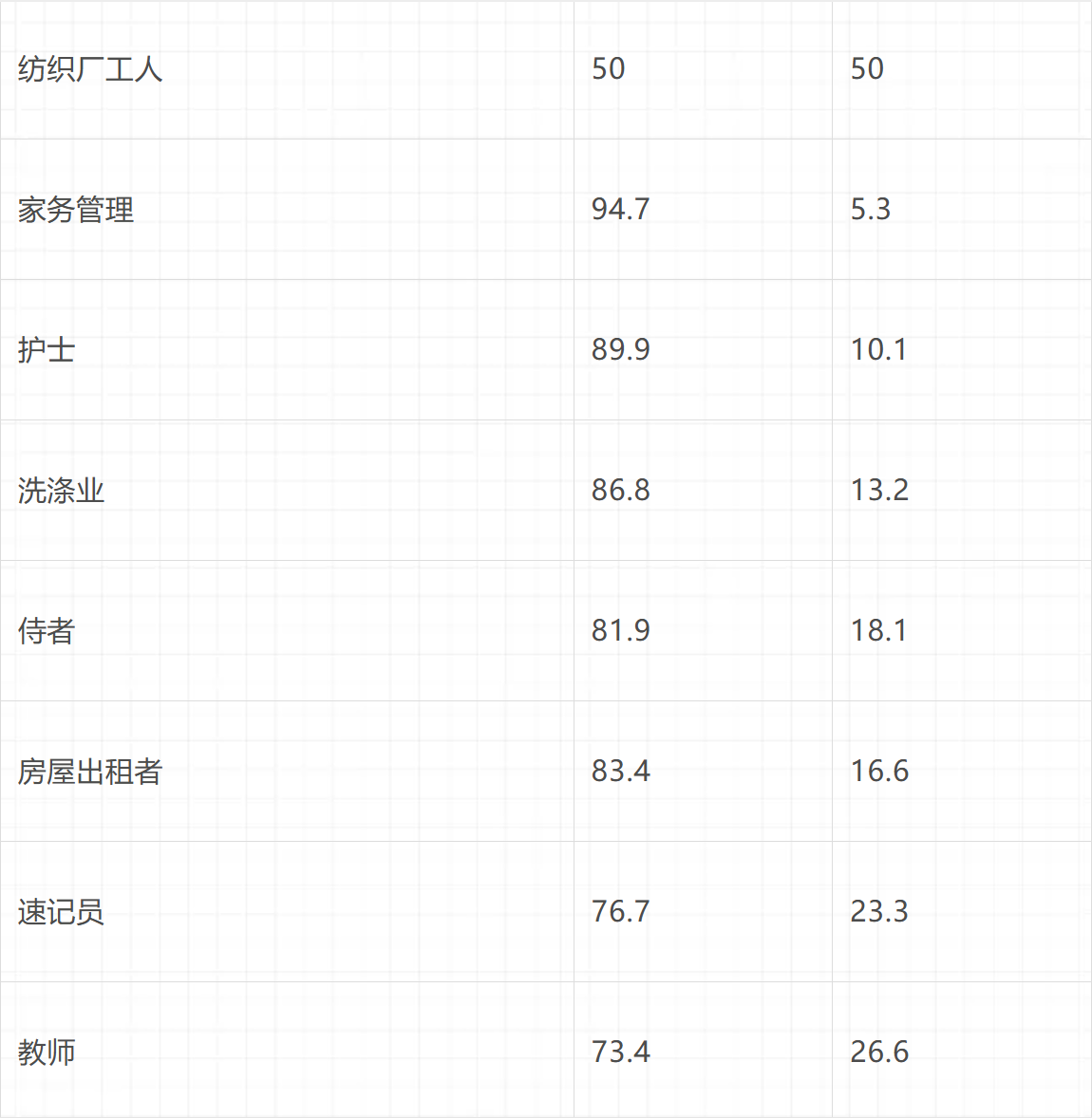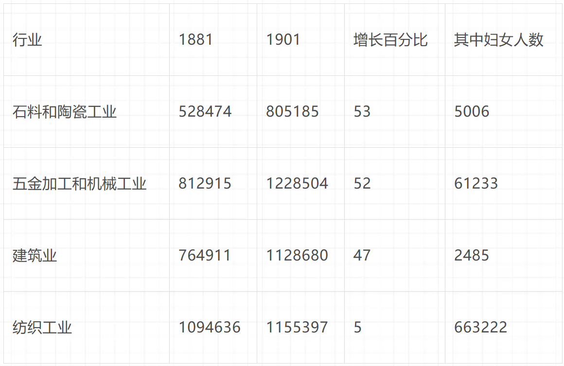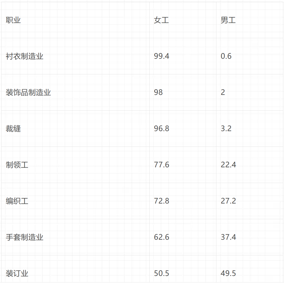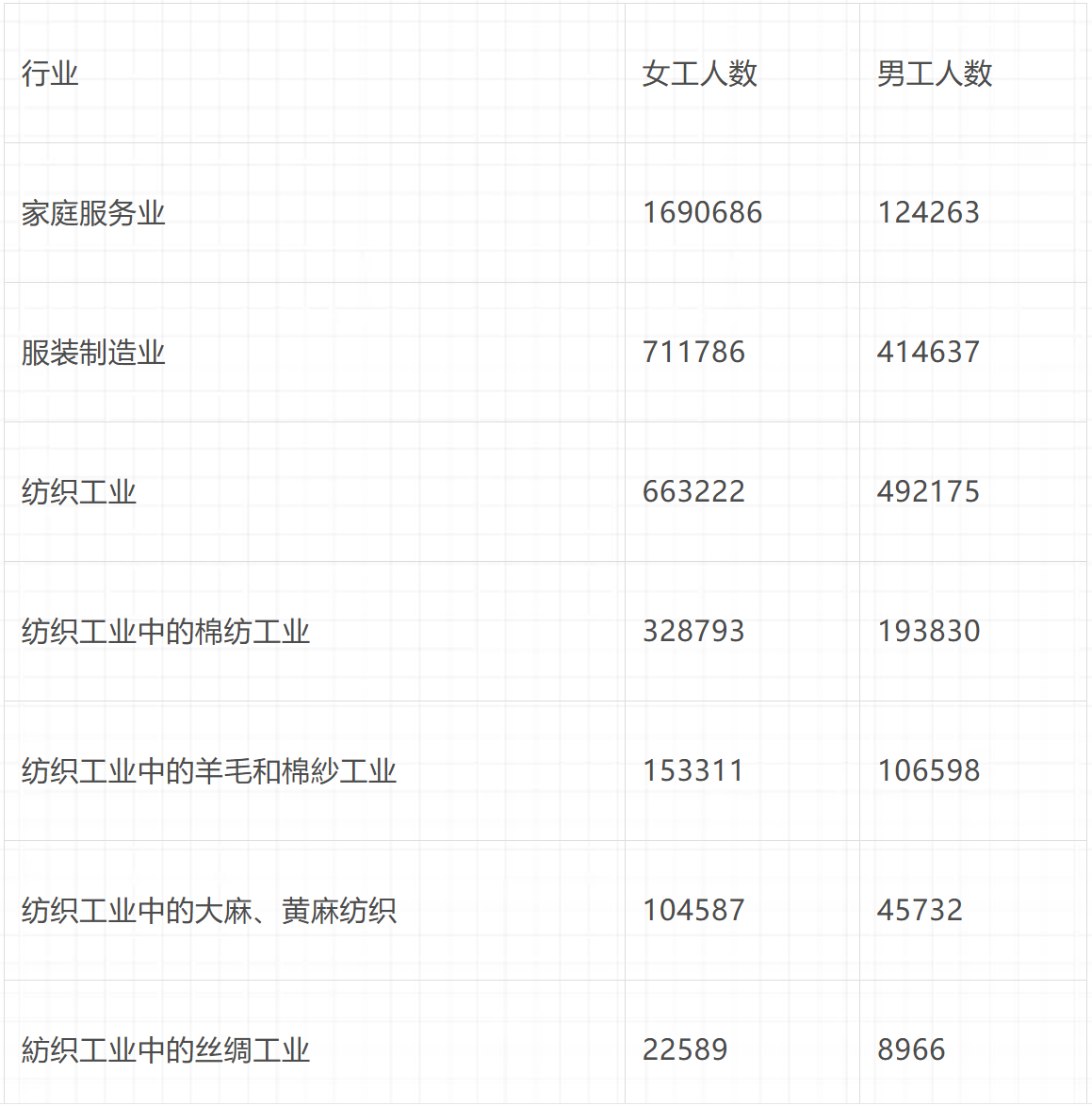 像在其他所有国家一样,凡在需要重体力劳动的行业,女性所占比例最小,例如,在矿山,男女比例是100:2.03,在采石场是100:1.65;在五金工业是100:1.06。与此相反,在妇女人数众多的纺织工业,男女比例是100:116,在服装制造业和洗涤业是100:1247,在衬衣制造业是100:3286。