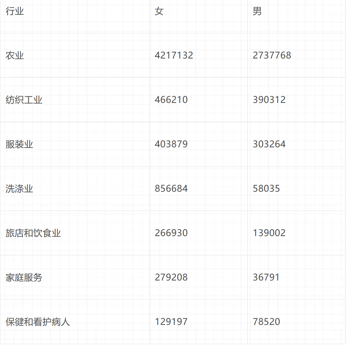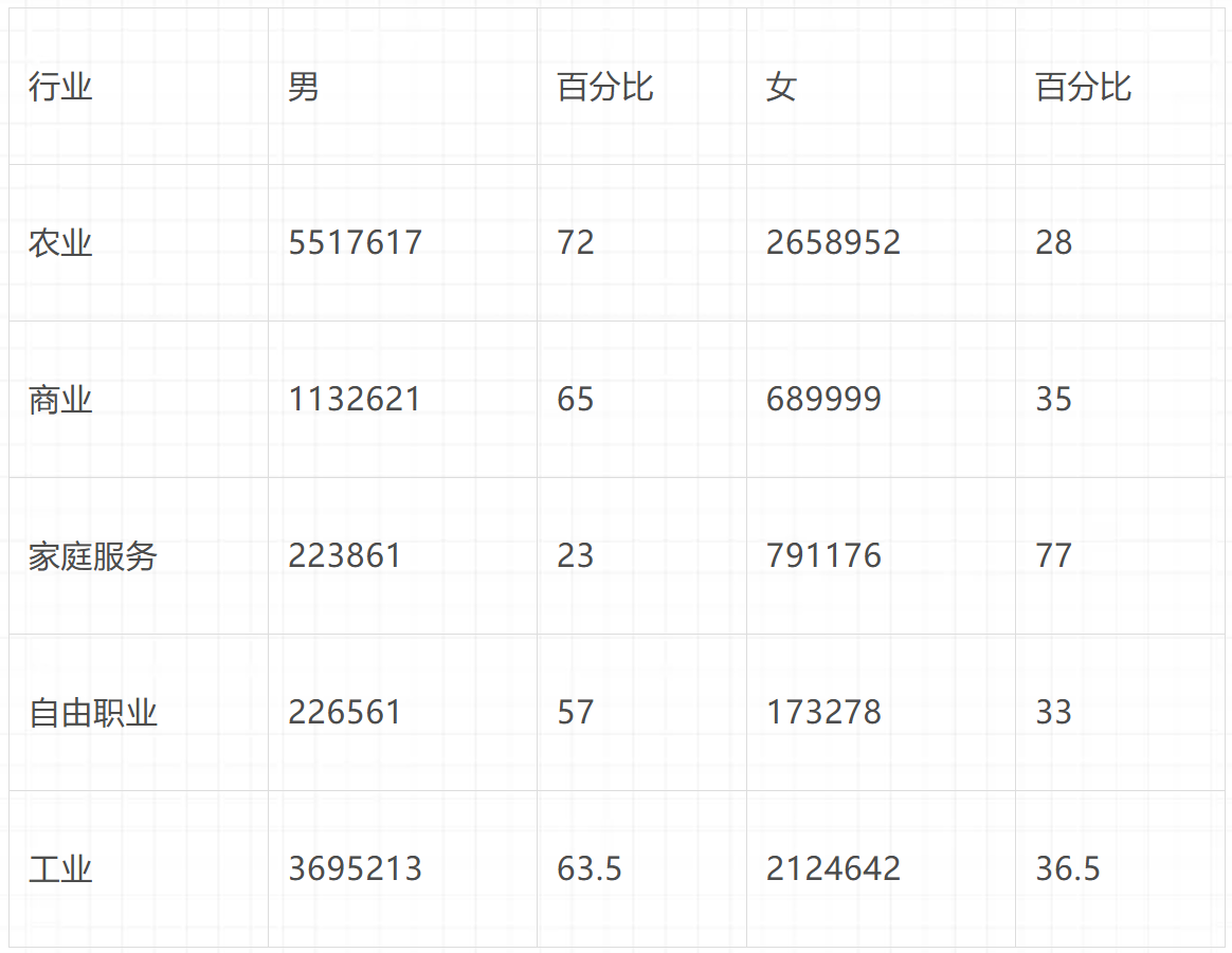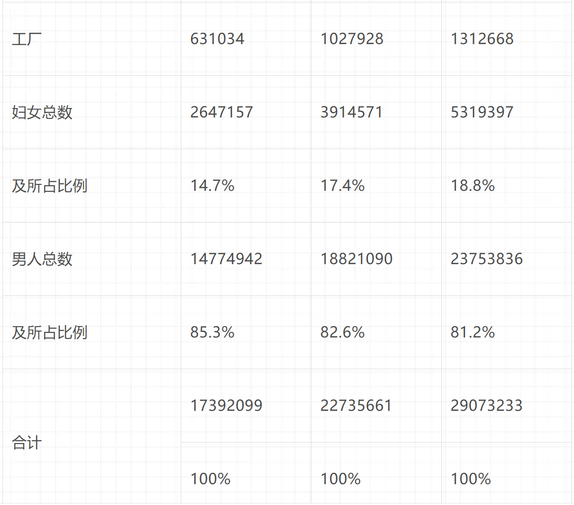 像在其他所有国家一样,凡在需要重体力劳动的行业,女性所占比例最小,例如,在矿山,男女比例是100:2.03,在采石场是100:1.65;在五金工业是100:1.06。与此相反,在妇女人数众多的纺织工业,男女比例是100:116,在服装制造业和洗涤业是100:1247,在衬衣制造业是100:3286。