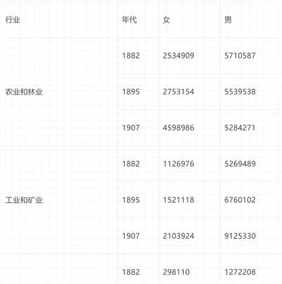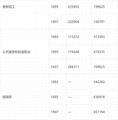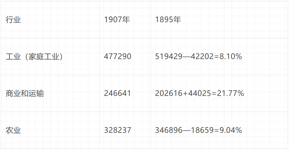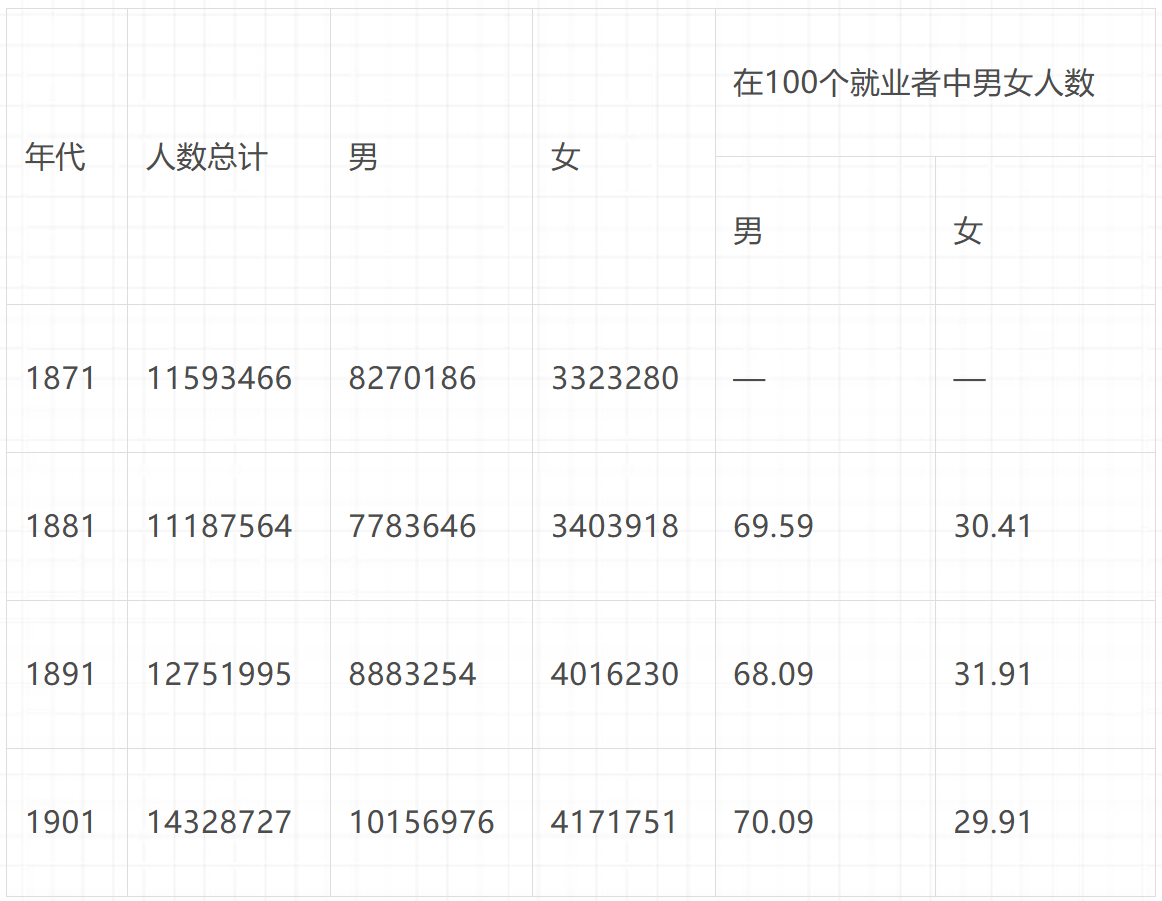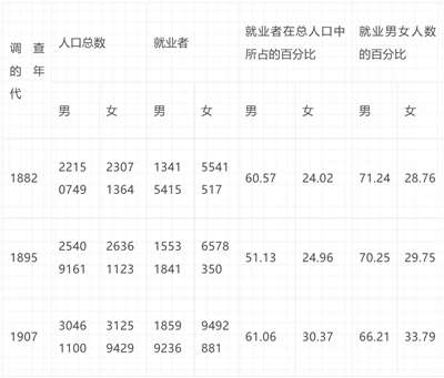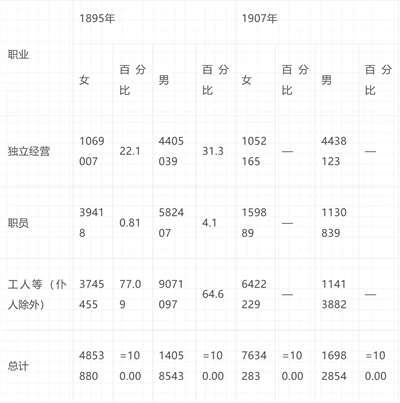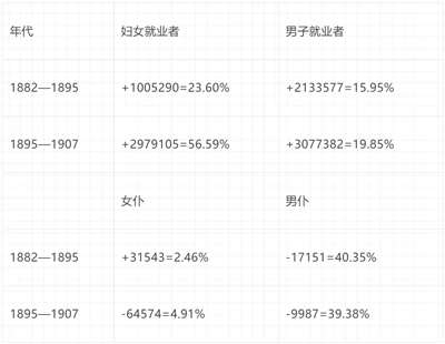 1882—1895年,就业者人数提高了16.6%,1895—1907年提高了19.34%,其中男性为15.8%及19.35%,而妇女就业者人数1882—1895年提高了18.7%,1895—1907年竟提高了44.44%!1882—1895年人口增长率只是19.8%,1895—1907年仅增长19.34%,可见就业者人数是绝对增加了,但是,就业男性数量的增加同人口的增长几乎处于同步增长状态,而女性就业者的数量则增长得最快。这说明生存斗争要求作出比从前更大的努力。