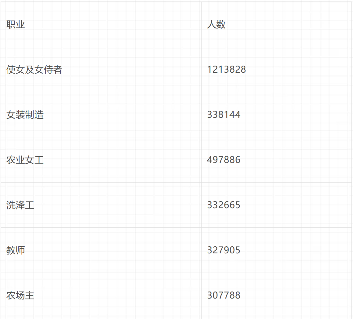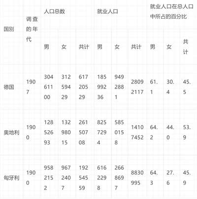 这张表还表明,职业妇女在所有文明国家的全体居民中所占的比例相当大,尤其在奥地利、法国和意大利职业妇女人数最多——估计奥地利和意大利的统计不仅仅限于人们所从事的主要职业,而且还包括了妇女个人从事的副业——职业妇女最少的是美国。