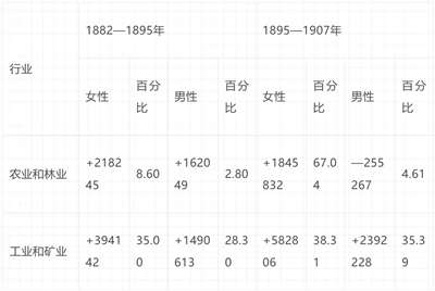 1882—1895年和1895—1907年德国男女就业者增(+)减(-)情况及占人口总数的百分比如下: