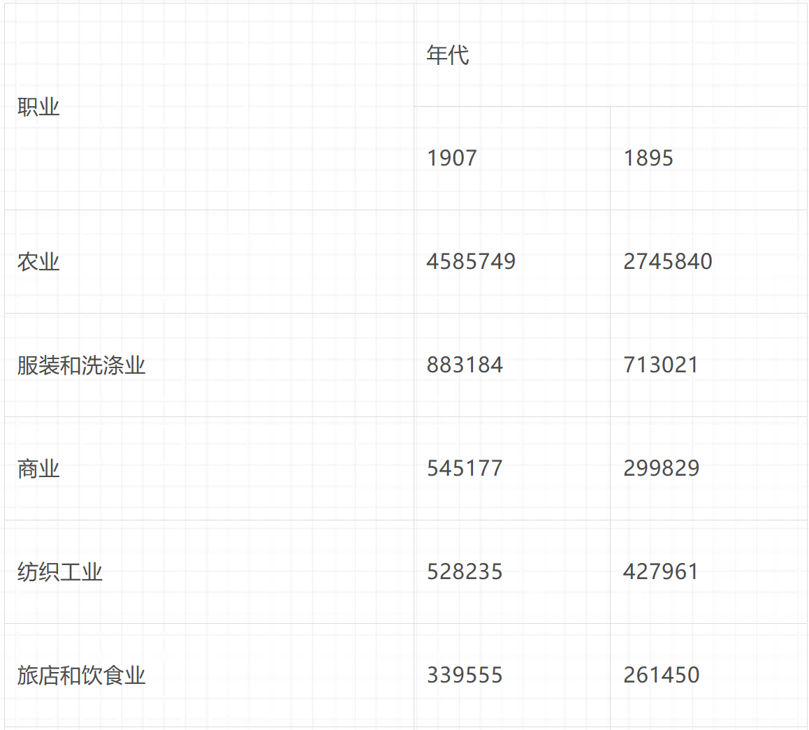 相反,妇女劳动力在服装制造业和商业部门增长的幅度相当大。同时,情况进一步表明,年轻的女工逐渐排挤掉年长的女工。由于25岁以下的妇女大多数是未婚者,而年长的妇女多数是已婚者或寡妇,于是年轻妇女代替了已婚妇女或寡妇。