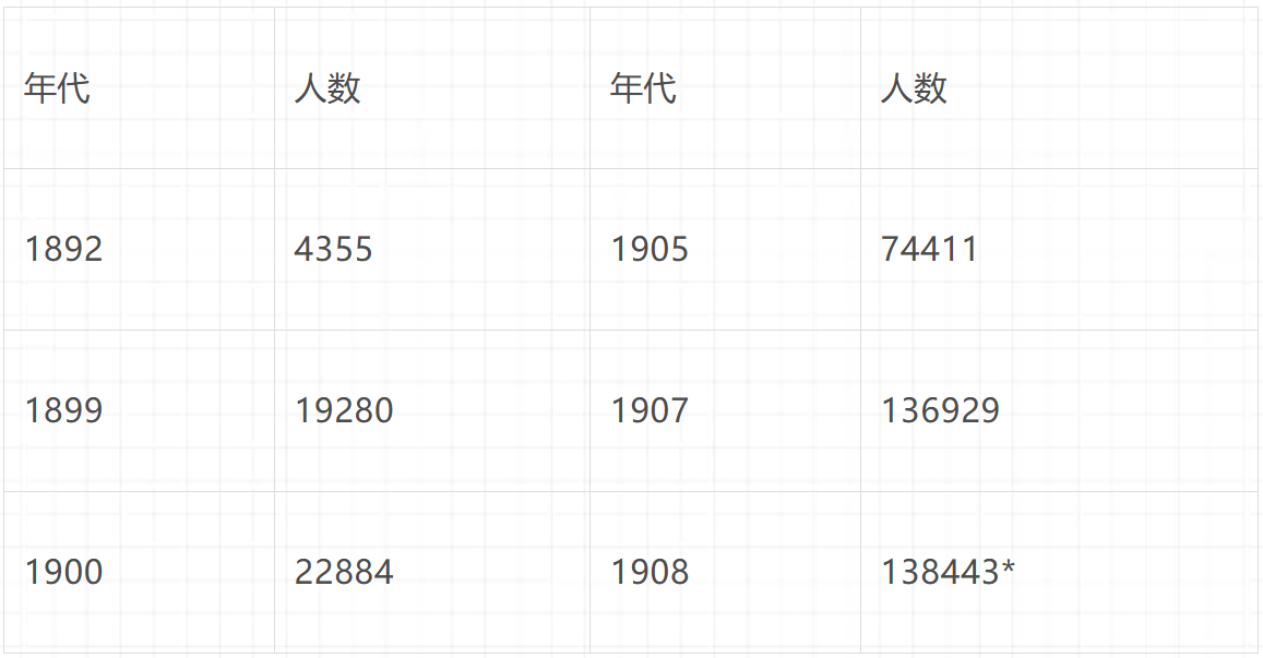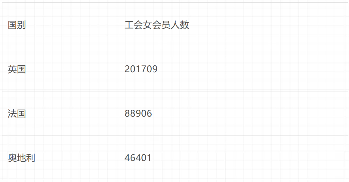 1892年女工仅占全体工会会员的1.8%,1908年占16%。根据第五次国际工会会议关于工会运动的报告,工会女会员人数如下: