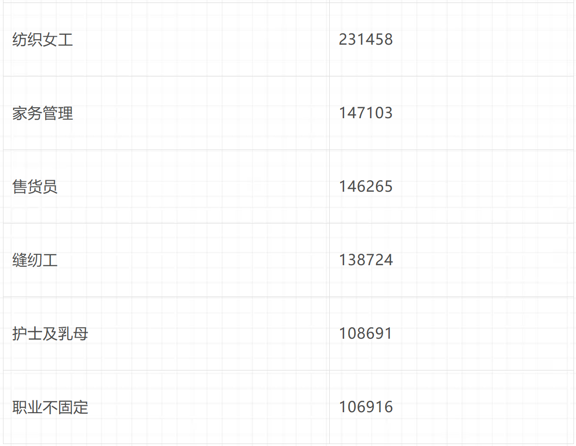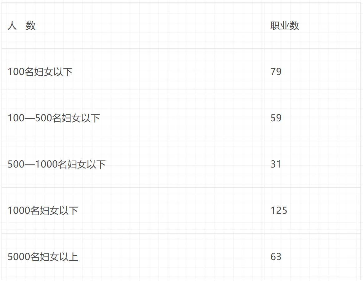 在妇女从业的303种职业当中,妇女在如下数量的职业中的人数如下: