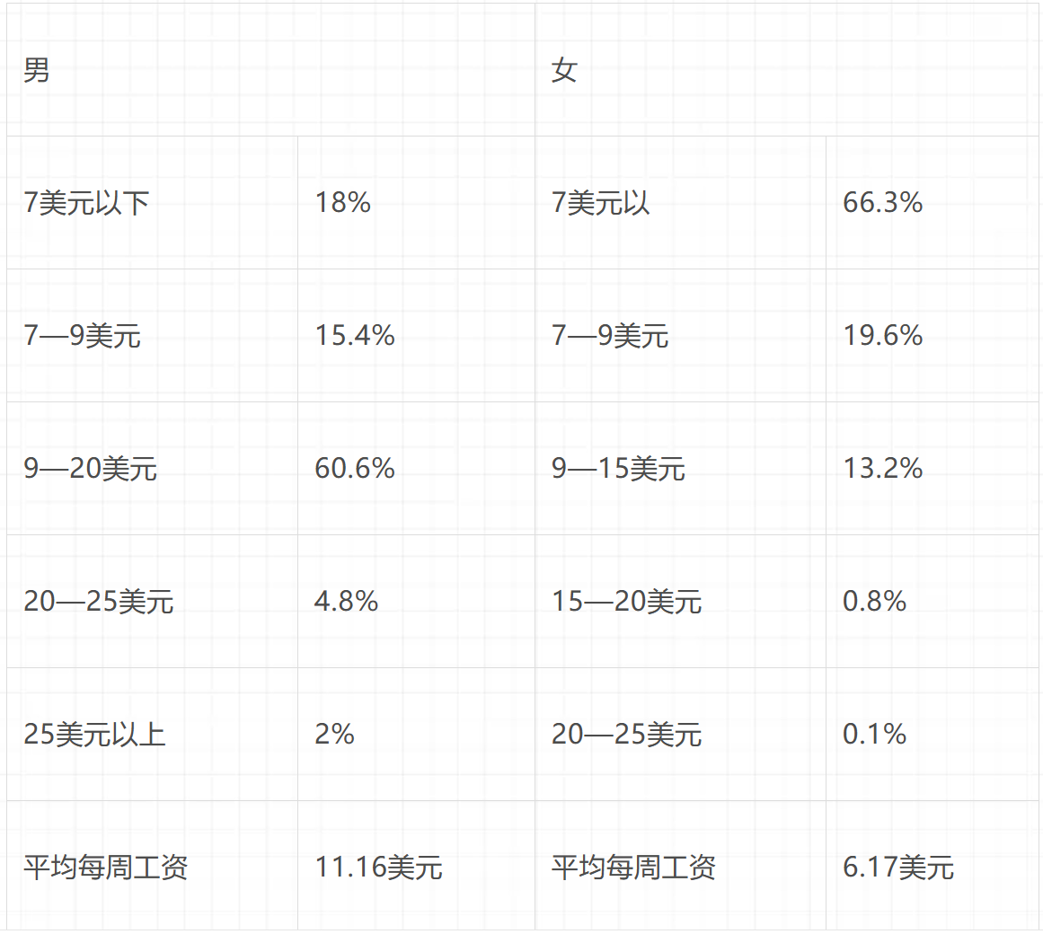 我们看到,所有男人中有60%的人每周可以拿到9美元以上的工资,而女工拿到9美元以上者仅占14.1%,她们当中三分之二以上的人(占66.3%)只能拿到7美元以下的工资。平均每周男工的工资是11.16美元,而女工工资是6.17美元,两者几乎相差一倍。