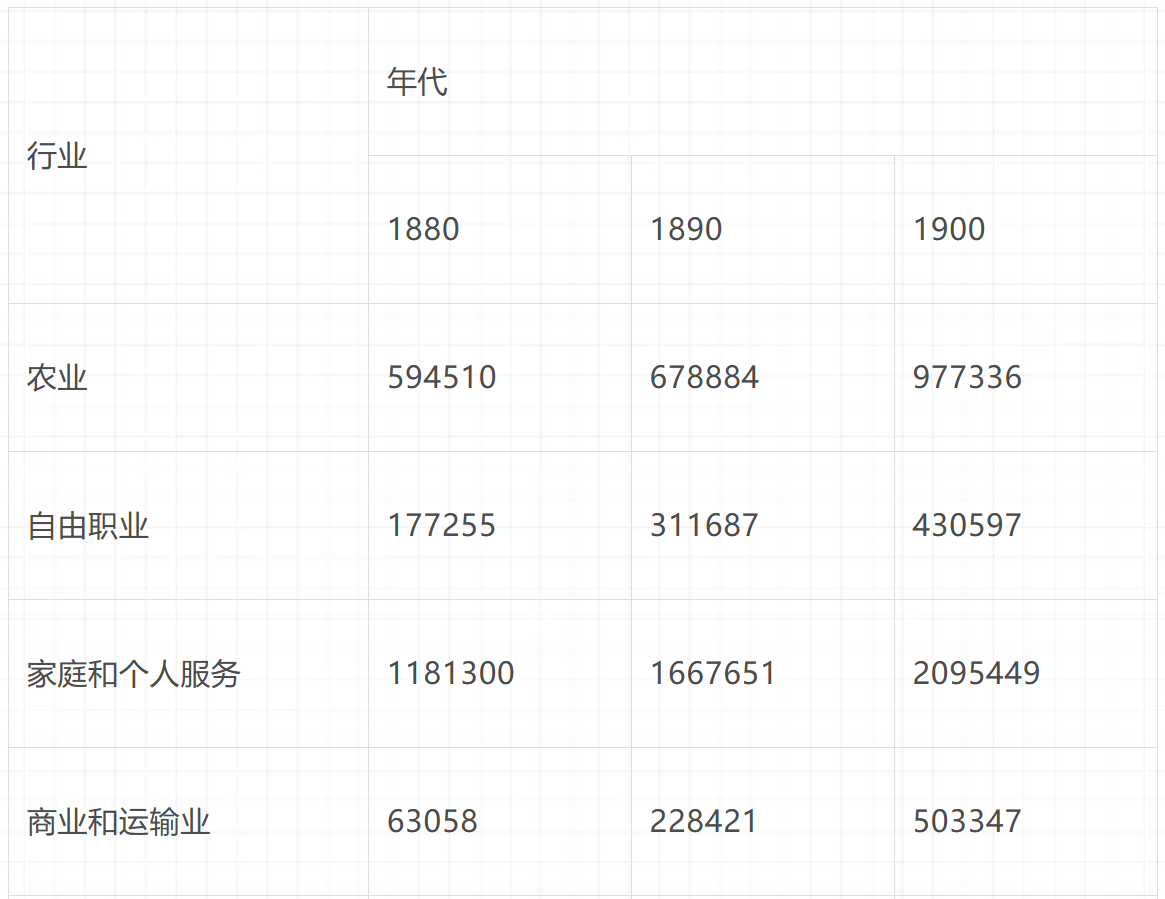 我们从中可以看出,妇女从业人数从1890年的3914571人增加到1900年的5319397人,就是说,这一数字的增长比整个人口的增长还要快,整个人口从1890年的62622250人增至1900年的76303387人,仅仅增加了21%。同样,男子从业人数也逐渐减少,受到妇女劳动力的排挤。1880年从业妇女在劳动者中所占比重不超过14.7%,而现在已增长至18.8%。