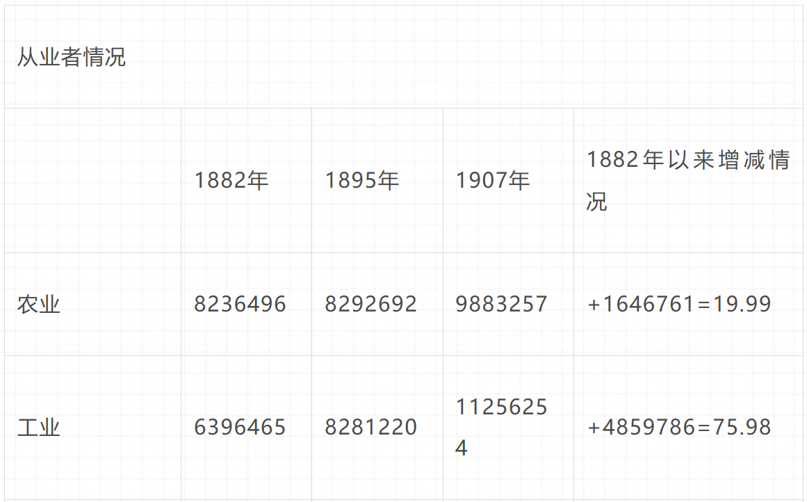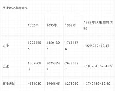 这些数字表明,在上述25年当中,人口及其职业发生了很大变动。以工业(采矿和工矿企业)、商业和运输为生的人口有所增加,而以农业为生的人口则有所减少;几乎所有增加的人口,即1882年至1895年增加的6548171人和1895年至1907年增加的9950245人都从事于工业、商业和运输。虽然以农业为主要职业的人口增加了1646761人,但是,这个数字远远低于整个人口的增长率,这类从业者的家属的人数甚至减少了1544279人,即减少了8%。