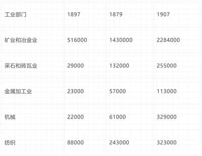 工业的情况有所不同。在25年的时间里,工业部门独立劳动者的数量减少了234024人,即减少了10.6%(从1882年到1895年减少了139382人,即减少了5.2%),而工业人口却增加了48%(从1882年到1895年增长了14.48%)。单独经营者和雇用一两个雇工的工厂有所减少。工人的数量从1882年到1895年增加了1859468人,从1895年到1907年又增加了2637414人。仅就不包括作辅助劳动的家庭成员在内的真正工人而言,他们的数量也从1895年的5899708人增加到了1907年的8460338人。在所有从事工业职业的人中,有1/3是工人(75.16%)。